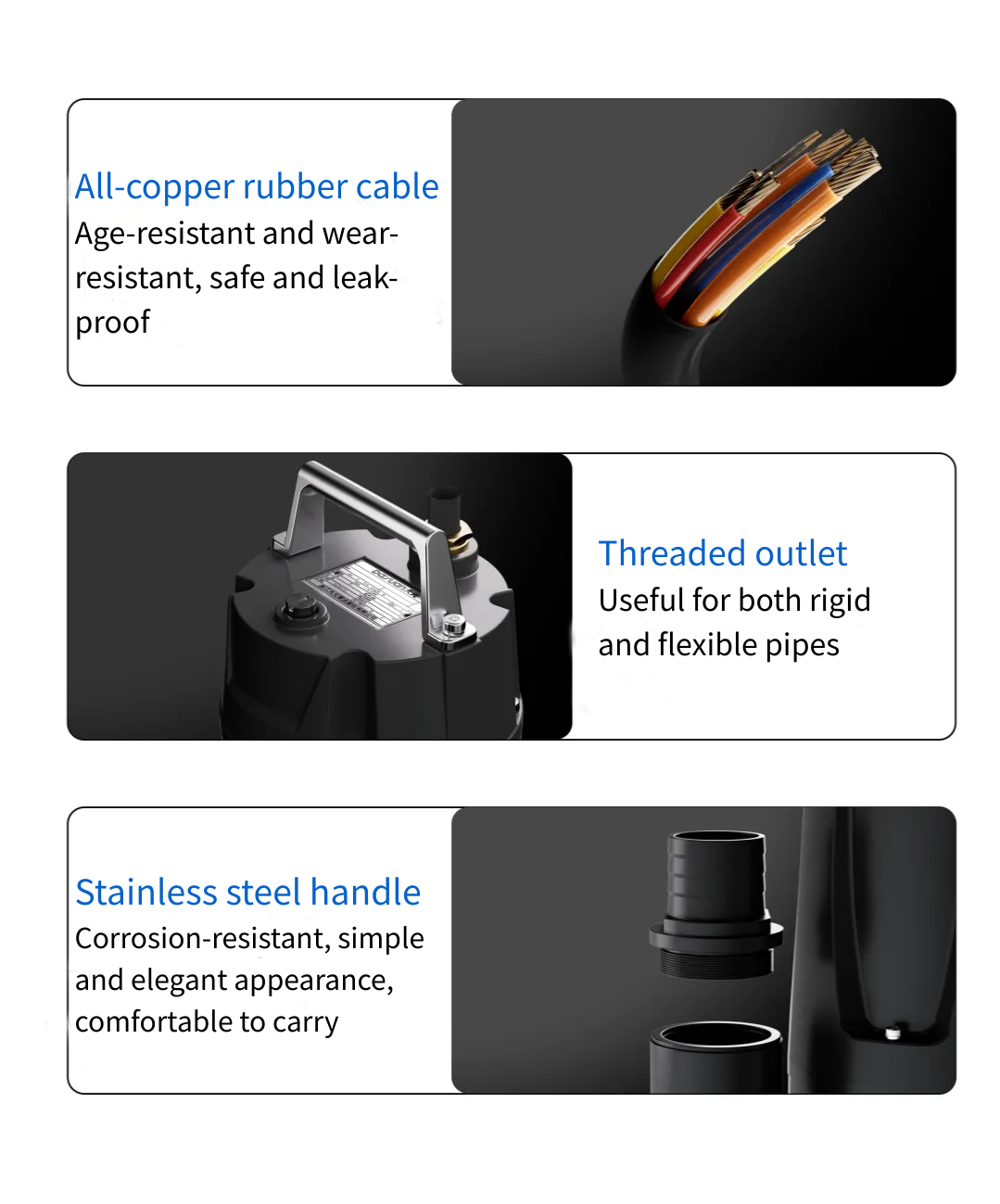 The pump comes with an all-copper rubber cable that’s resistant to wear, aging, and leaks. The threaded outlet makes it easy to hook up to both rigid and flexible pipes, and the stainless steel handle not only looks clean and simple but also makes it comfortable to carry around.